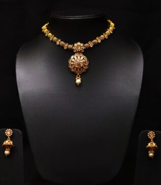 This dazzling close-neck necklace features layered white stones set in an ornate design that captures both tradition and glamour. The detailed pattern with delicate drop accents offers graceful movement, while the long statement earrings and matching maang tikka lend a touch of timeless splendour.