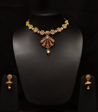 Designed with precision and grace, this radiant collar set features rows of glimmering marquise-shaped motifs, each surrounded by delicate floral accents. The gentle fall of each element creates a soft, cascading neckline—perfectly balanced by long, coordinated earrings that mirror the design.